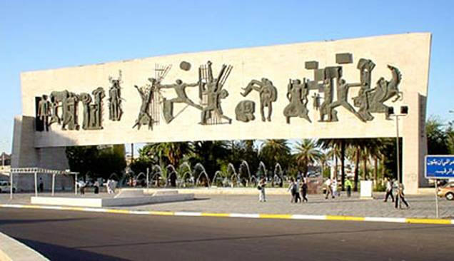 وهنا لابد من الإشارة الى مساهمة المهندس المعماري رفعت الجادرجي الذي صمم البناء حامل المنحوتات والذي جعله يمتد بطول 50 متراً وبعرض عشرة أمتار ويرتفع عن الأرض بستة أمتار من حافته السفلى وأصبح البناء شبيه بالبوابات الآشورية القديمة ، ويجب الإشارة الى أن هذه البوابة أصبحت مدخلاً لحديقة الأمة والتي صممها أيضاً المهندس رفعت الجادرجي بحيث أن أي شخص إذا نظر من بعيد الى النصب فسيراه كما لو أنه عبارة عن لافتة كالتي كان المتظاهرون يرفعونها بشكل مستمر دعماً للثورة !!