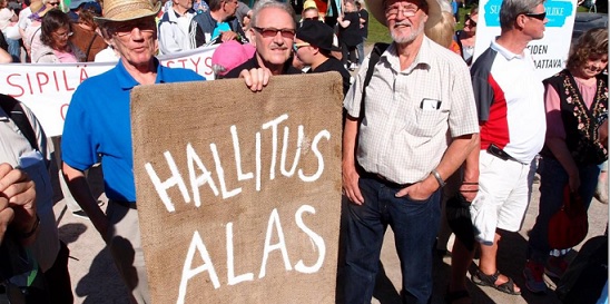 الصورة بعدسة "تويفو كوفيستو" واللافتة تقول "تسقط الحكومة"اظهرت نتائج اخر استطلاع لهيئة الاذاعة الفنلندية ان احزاب المعارضة وقوى اليسار تحقق تقدما متواصلا على حساب قوى الائتلاف الحكومي اليميني الذي خسر الكثير من مواقعه لتصل مجموع اصوات احزاب الائتلاف اليميني الثلاث الى 47% .