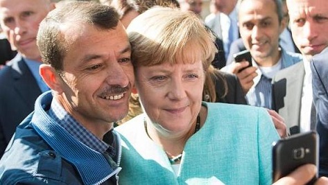 التقاطها صور مشتركة (selfies) مع اللاجئين، رأسها بجانب رأس لاجئ، نُشرت بعد دقائق في وسائط التواصل الاجتماعي، فدارت دورتها حول العالم بسرعة الانترنت المعروفة ووصلت بالطبع بعد لحظات الى العالم الشرقي، وفُهمت ايضاً كأيماءة للترحيب من قبل رئيسة الحكومة وكدعوة شخصية منها للاسراع في القدوم.